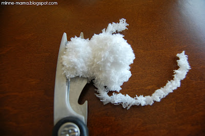 With the thick yarn I rolled the completed ball around in my hand like a snow ball and then went around the ball to trim off pieces that stuck out. With the thinner yarn, I didn't have to roll it around, I just snipped off the pieces that were obviously longer.